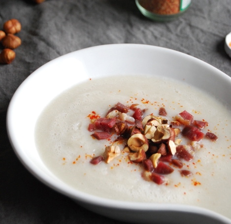 Veloute de topinambur,”gesiers” de pato, crocante de pistacho y aceite de sésamo